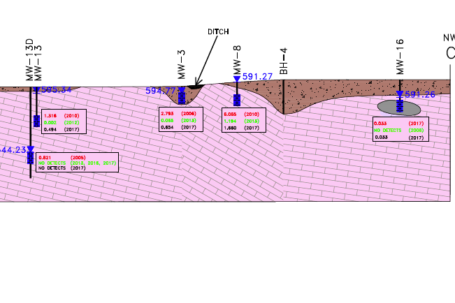 The example below presents a detailed subsurface cross-section from one of our environmental projects. This illustration highlights the depth of analysis inherent in our work, showcasing how we uncover complex subsurface conditions to inform remediation strategies and support informed decision-making for clients.